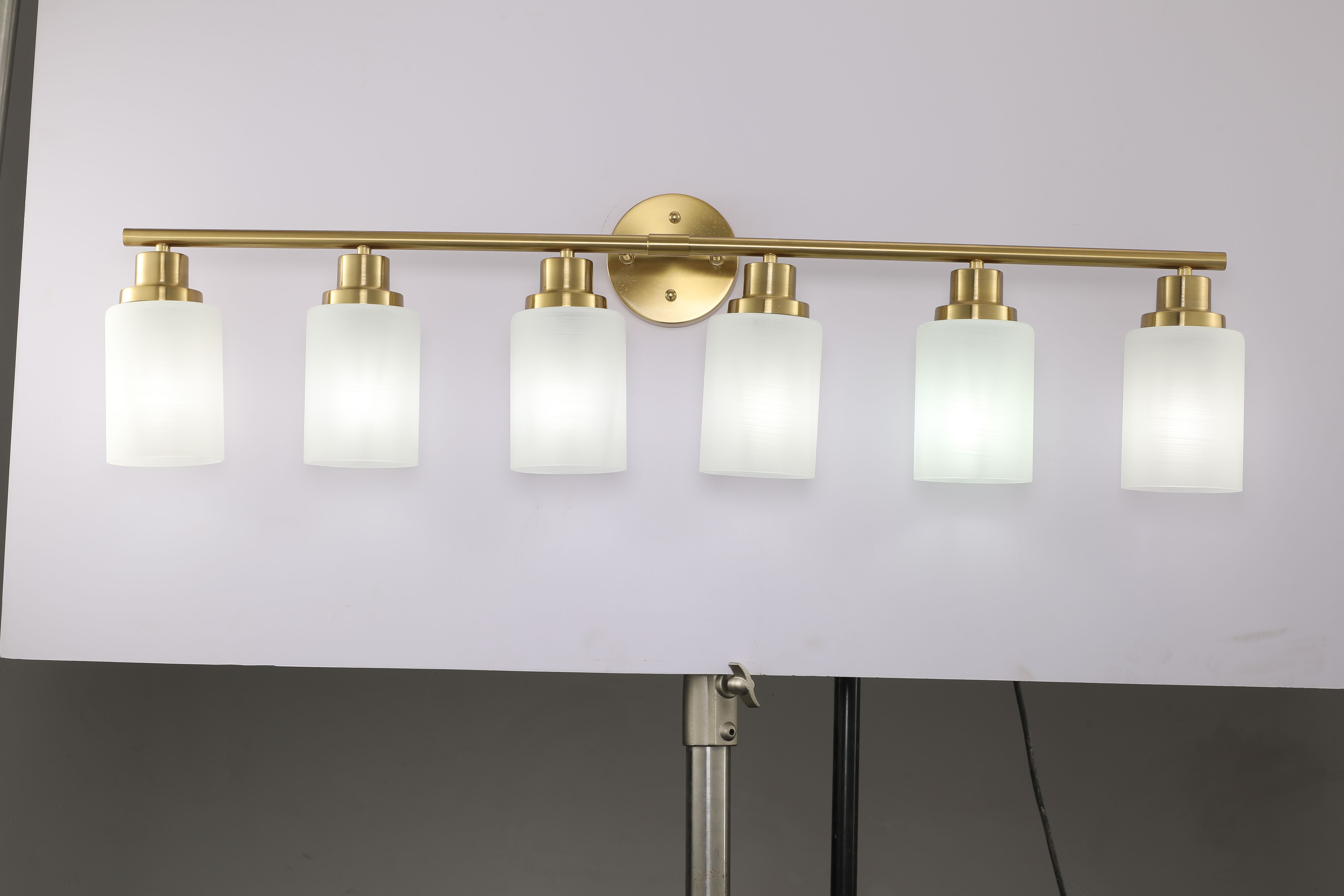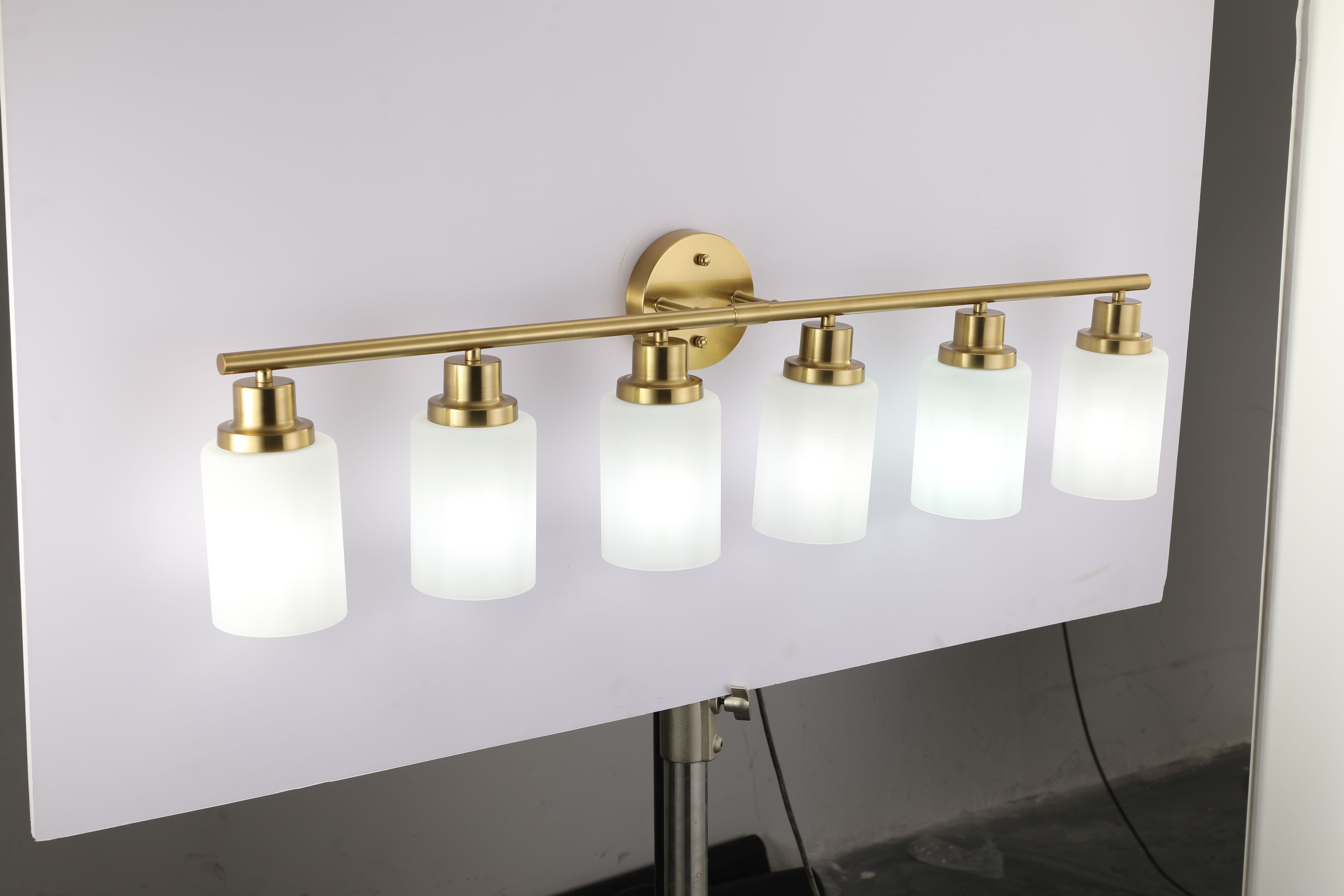 Home > 6-Light Golden Bathroom Vanity Light Fixture, Frosted Glass Shades, Modern Wall Mounted Lighting (No Bulbs)