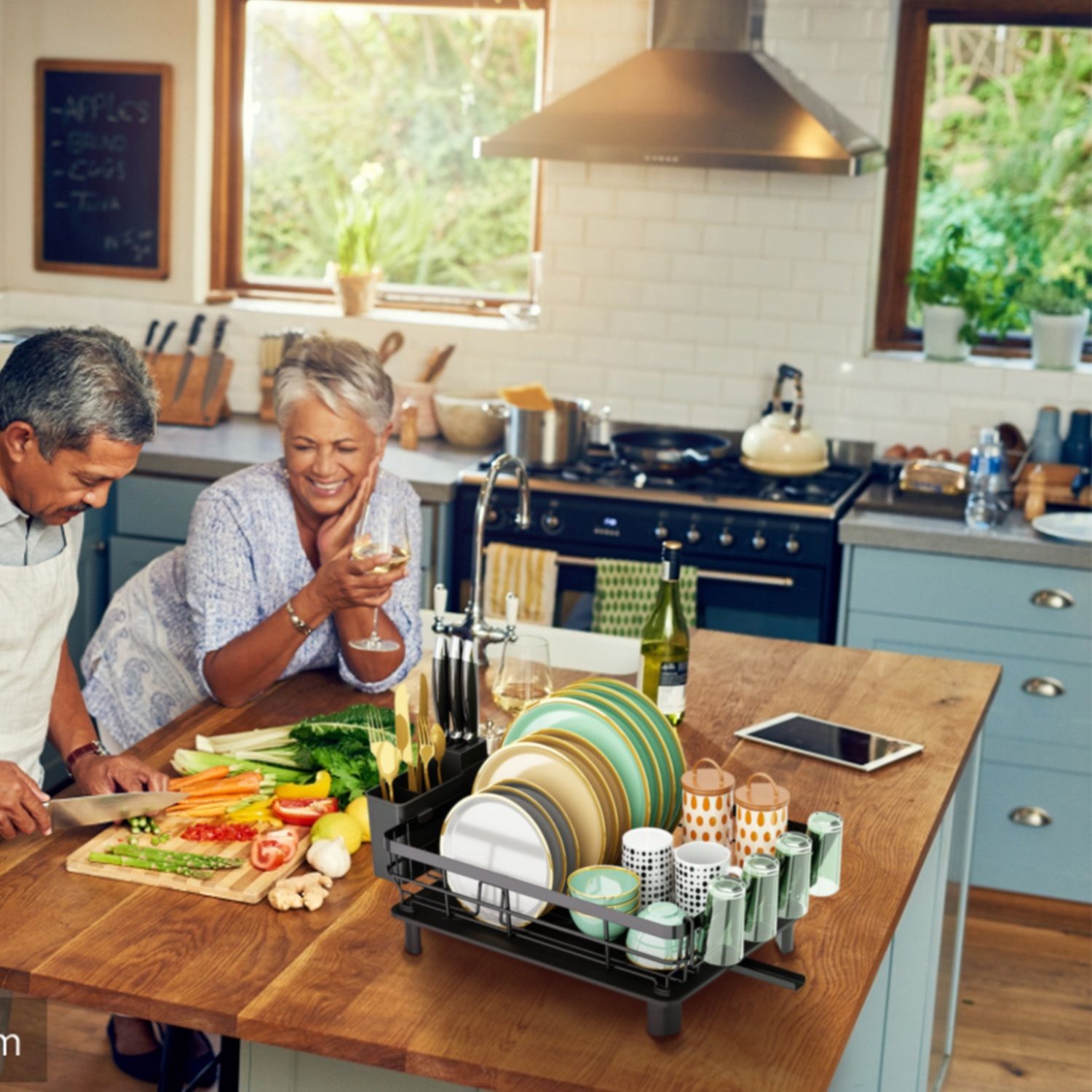 Multifunctional Dish Drying Rack: This dish drying rack with large compartment is suitable for all types of tableware like plates, bowls, cups, and pans. It’s also equipped with other accessories including a cutlery holder and a 4-hook glass rack for safe and convenient storage. Tips: The diameter of the plate should be less than 11in. Say goodbye to messy tableware piled up on countertop.